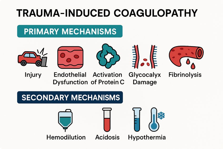 Trauma-induced coagulopathy (TIC) is initiated by a cascade of events triggered by tissue injury, hypoperfusion, and systemic inflammatory responses. It is now understood to be a distinct, multifactorial entity with both endogenous and exogenous contributors.