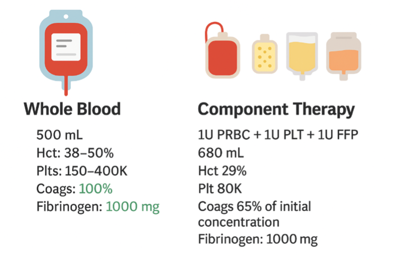 Building on these lessons, recent practice has increasingly embraced whole blood (WB) for trauma resuscitation. WB simplifies logistics, reduces donor exposure, and provides balanced hemostatic components in a single product. Military and prehospital experience have driven its resurgence, with observational data suggesting improved outcomes [10].