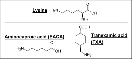 Fortunately, there are strategies to manage excessive fibrinolysis and the associated bleeding. Pharmacologic agents can be given preemptively to prevent or decrease fibrinolysis. These include antifibrinolytic agents, which happen to be the most extensively studied blood conservation agents. Their value in decreasing bleeding and allogeneic transfusion requirements has been well demonstrated across a wide range of clinical settings.1,2 Aprotinin, a serine protease inhibitor, was once highly utilized for both its’ antifibrinolytic and anti-inflammatory properties, but safety concerns including increased mortality led to aprotinin’s withdrawal from clinical use.3 Although limited re-introduction of aprotinin in Canada and Europe had taken place for select high-risk cases, ongoing uncertainty about the value of aprotinin will limit the remainder of our discussion to the currently available lysine analogue antifibrinolytic agents: epsilon-aminocaproic acid (EACA) and tranexamic acid (TXA) (Figure 1).4
