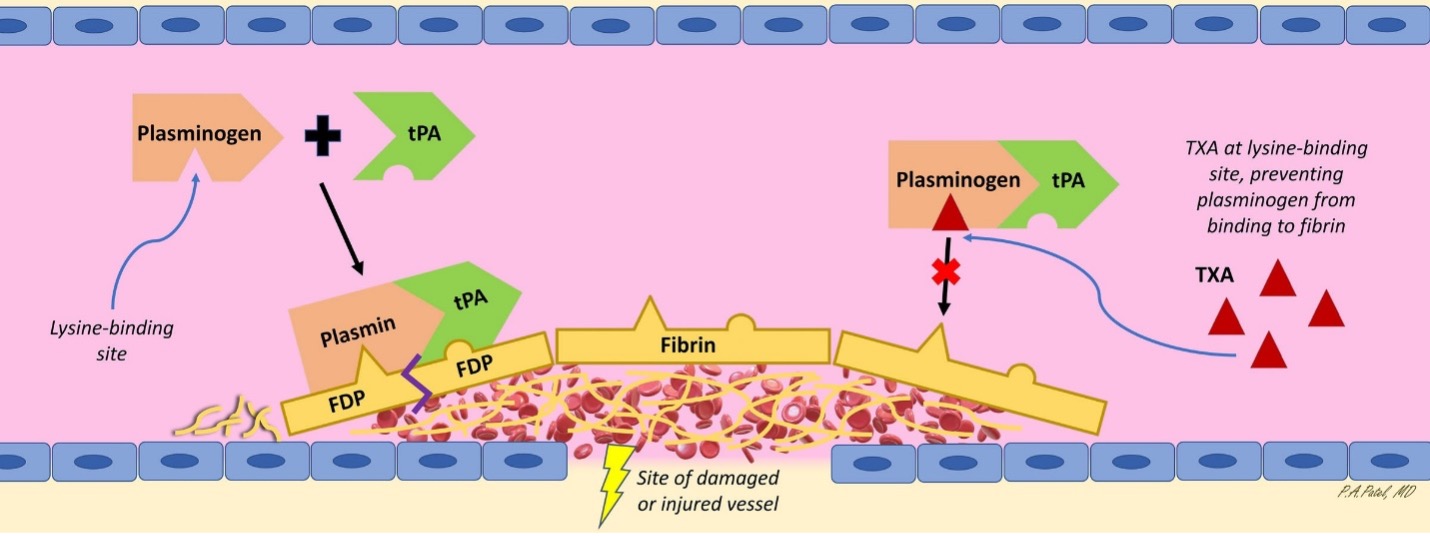 Figure 2. Fibrinolysis occurs when plasmin degrades the fibrin within a clot into FDPs. However, in the presence of a lysine analogue antifibrinolytic, competitive binding at the lysine-binding site on plasminogen prevents plasminogen’s activation to plasmin. (EACA would act at same site as TXA shown in figure.) FDP: fibrin degradation product; tPA: tissue plasminogen activator; TXA: tranexamic acid; EACA: epsilon aminocaproic acid. [Reprinted with permission from Reference #1].