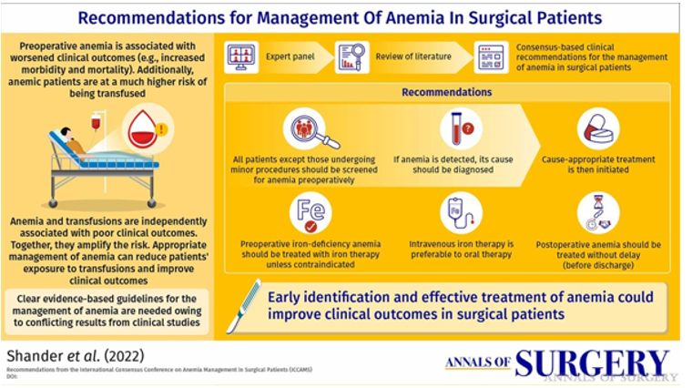 4. Shander A, Corwin HL, Meier J, Auerbach M, Bisbe E, Blitz J, Erhard J, Faraoni D, Farmer SL, Frank SM, Girelli D, Hall T, Hardy JF, Hofmann A, Lee CK, Leung TW, Ozawa S, Sathar J, Spahn DR, Torres R, Warner MA, Muñoz M. Recommendations From the International Consensus Conference on Anemia Management in Surgical Patients (ICCAMS). Ann Surg. 2023 Apr 1;277(4):581-590. doi: 10.1097/SLA.0000000000005721. Epub 2022 Sep 21. PMID: 36134567; PMCID: PMC9994846.